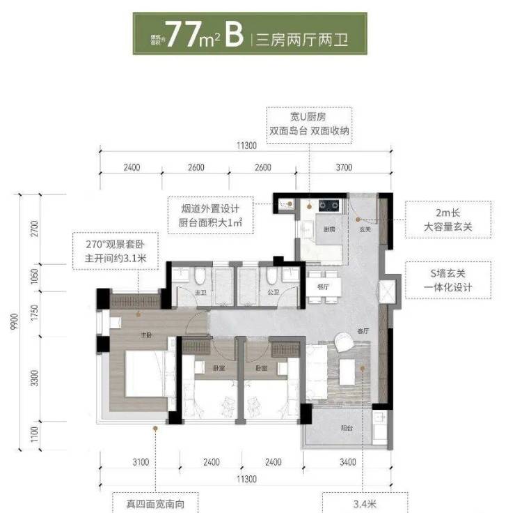 77㎡户型:次卧与客厅灵活可变,适合单身或新婚夫妻全周期需求