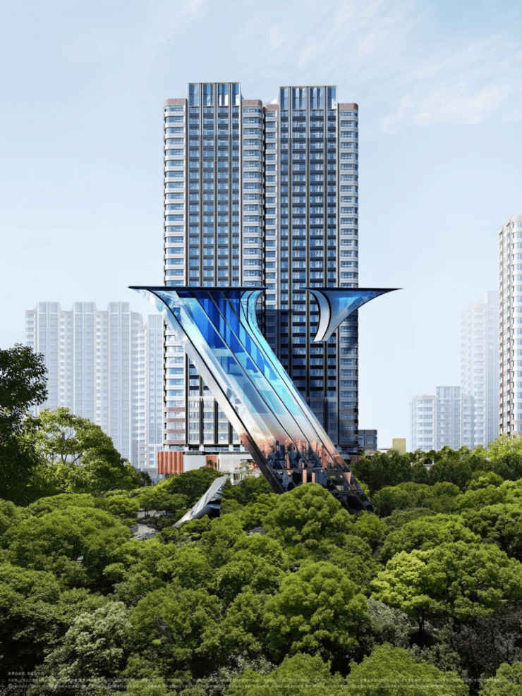 比如,选取珍珠蓝、香槟金、海派砖红等色彩,约270°圆弧建筑立面。