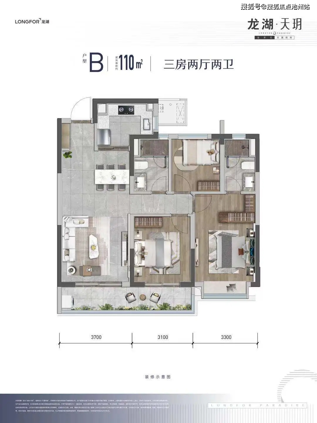 110户型是市面目前最流行的三间南向连廊户型,得益于面积比较大,所以南向三间的面宽尺度比较充足,横厅达到了3.7米。