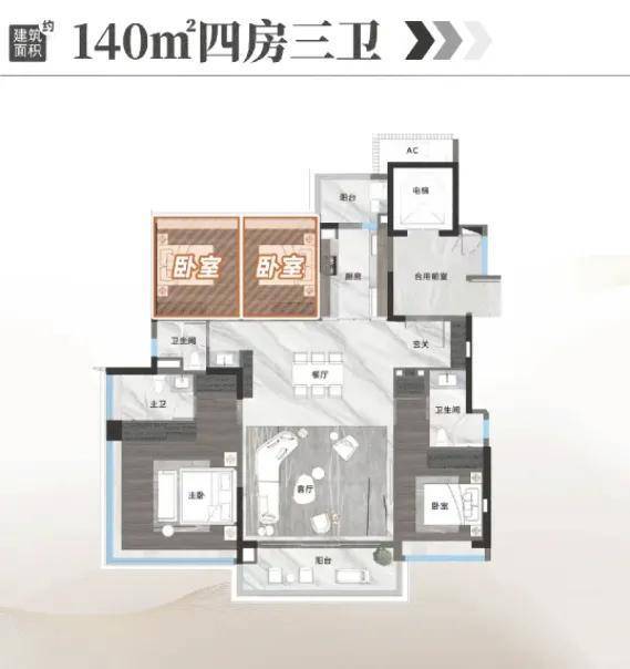140㎡四房户型做到了私梯入户,“四叶草” 布局减少了空间浪费,南向面宽达 13.2 米,采光充足。客厅、厨房、阳台贯通形成约 40㎡的家庭社交区,主卧配备 270° 环幕观景窗,躺在床上就能看到湖景,适配科创精英家庭的需求。