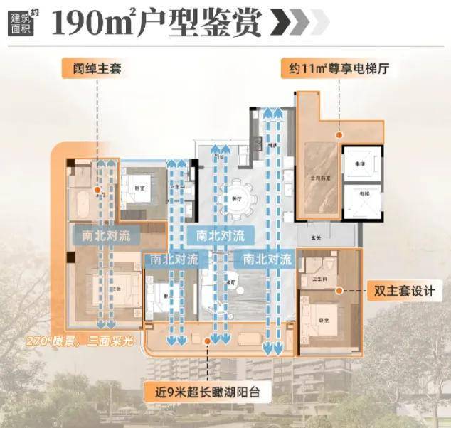 190㎡四房是改善热门,南向面宽升级到 17.6 米,搭配 9.4 米的长阳台,相当于把客厅搬到了湖边。双套房设计能满足三代同堂的居住需求,主卫有双台盆和观景浴缸,空间舒适度较高。