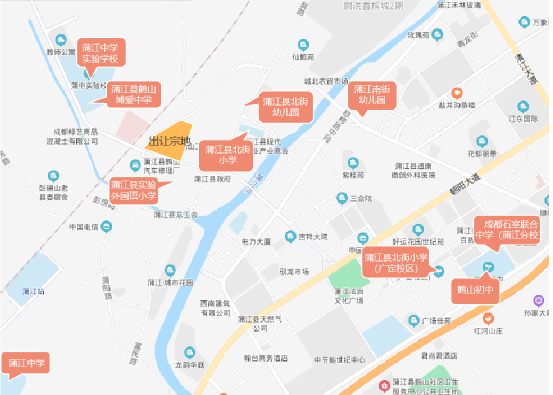 宗地周边的生态资源很有看点。在双拥路北侧、距离宗地约400米,即为由蒲江中学原老校区打造成的了翁公园。在土地东北角约100米,即为规划的文武庙公园,是蒲江规划的滨江绿地体系中六大公园之一。该公园布局在文庙和武庙周边,结合文庙、武庙、老城墙遗址,以及大北街东侧规划的商业街区、文创街坊,将打造成集文化体验和滨水休闲为一体的市民文化核心。此外,距离地块位置不到500米,即为蒲江河,这也是已呈现的距离最近的景观资源。其次,教育资源也很丰富。除了一街之隔的的蒲江县实验外国语小学外,200米范围内还有蒲江县北街幼儿园、蒲江县北街小学,在2公里范围内的教育资源更是覆盖到高中。包括蒲江南街幼儿园、蒲江中学实验学校、蒲江县鹤山博爱中学、鹤山初中、成都市石室联合中学(蒲江分校)、蒲江中学。