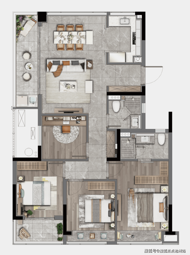 此外,该户型还设计了一个南向生活阳台,可用于晾晒。如此一来,诗意的远方,与当下的生活,在一套房子里就能实现!