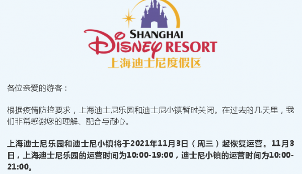 11月2日,上海迪士尼度假区发布通知,上海迪士尼乐园和迪士尼小镇将于2021年11月3日(周三)起恢复运营。通知全文如下: