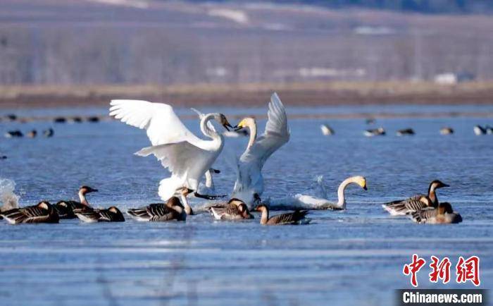 中新网沈阳3月16日电(李晛 王景巍)春日伊始,湿地河畔,一片水域日渐喧闹起来。在沈阳市法库县獾子洞湿地,千余只白鹤如“精灵”般跃然水上,与空中飞舞的天鹅相映成趣,蔚为壮观。