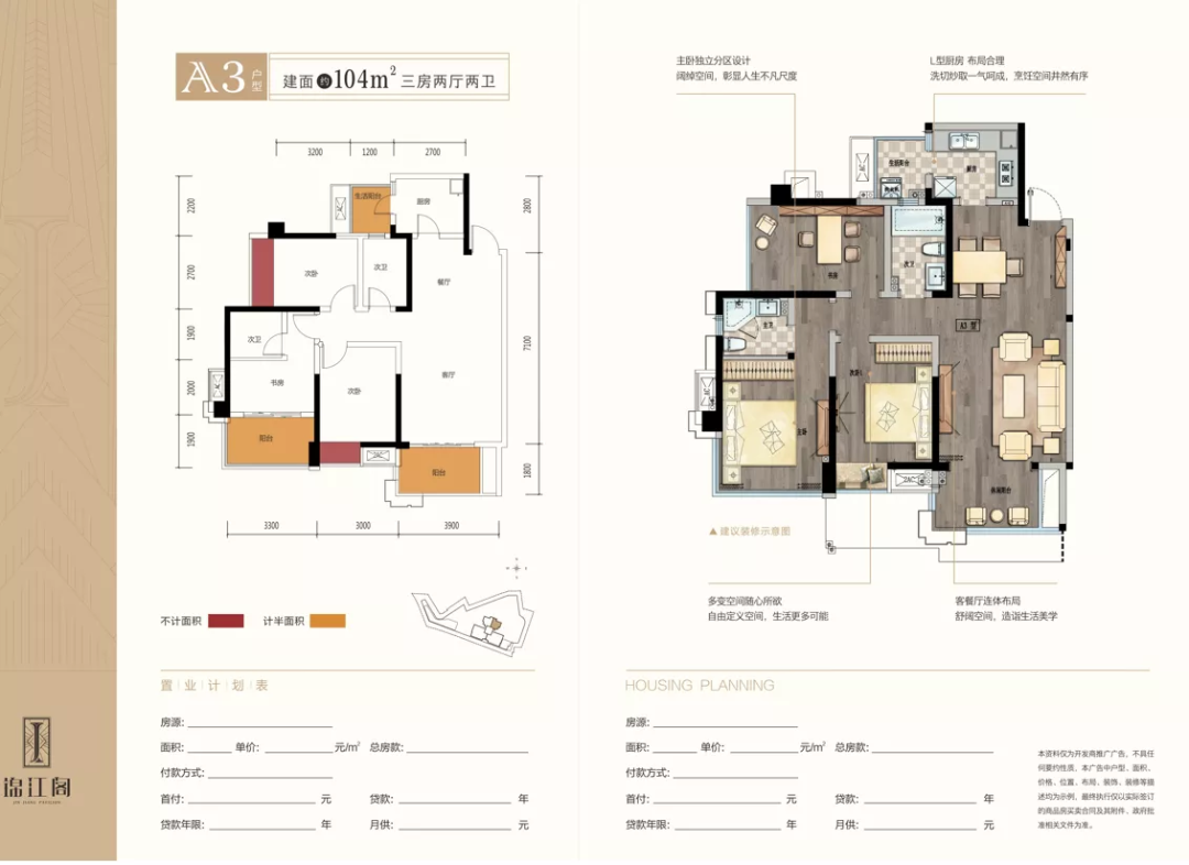 104平户型也是卧室带阳台半赠送,两间次卧飘窗全赠送。