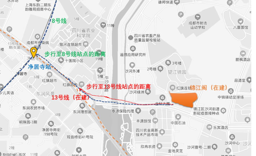 锦江阁距离最近的地铁站是8号线净居寺站,约800米。但是距离在建的13号线净居寺站进站口,只有约450米。
