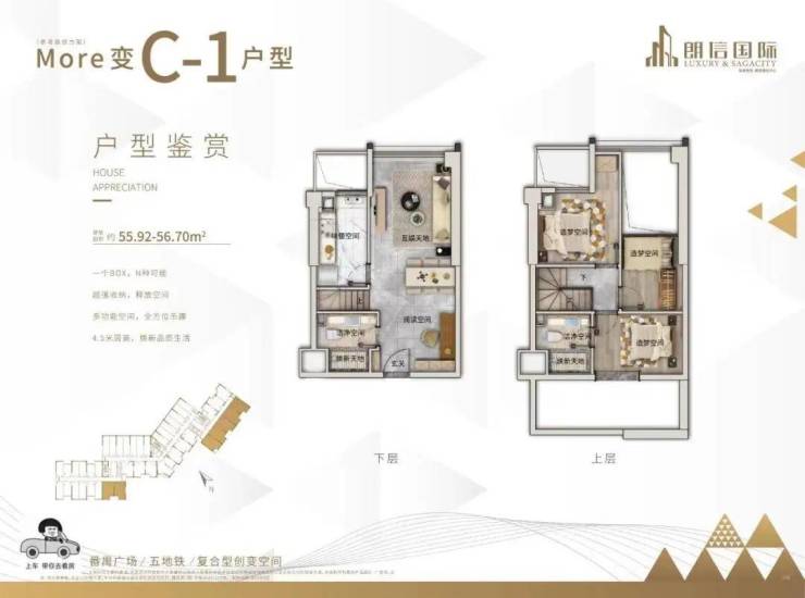 建筑面积:56平方3+1户型(极简轻奢风)