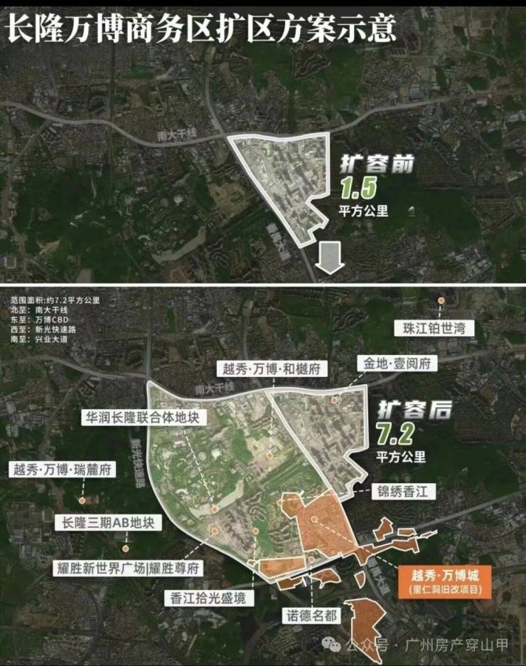 去年4月,万博官宣扩容,占地面积由1.5平方公里延展至7.2平方公里,覆盖长隆、里仁洞片区,规模甚至超越6万平方公里的珠江新城,剑指世界级地标商圈。