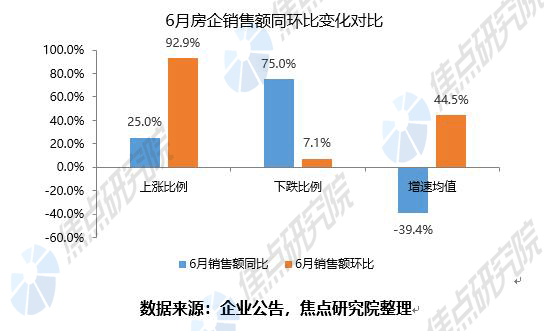 与5月相比,房企销售已经出现触底回弹迹象,28家上市房企6月销售额均值为129.7亿元,环比增速均值为44.5%,仅有两家6月销售额出现环比下滑,有4家环比增幅在100%以上,金地商置增幅值达到121.6%。