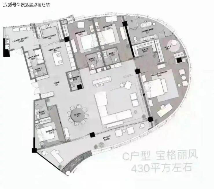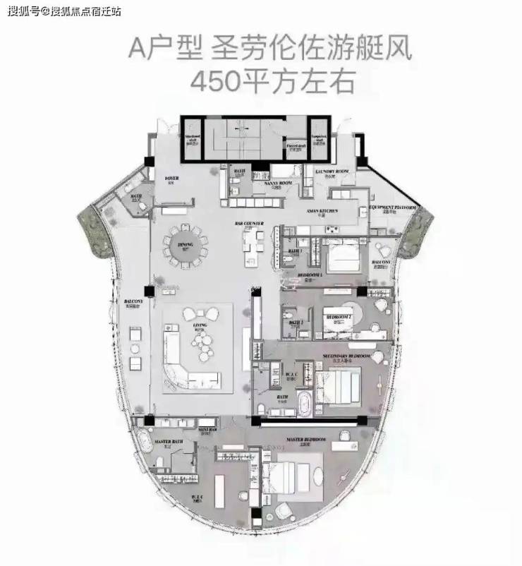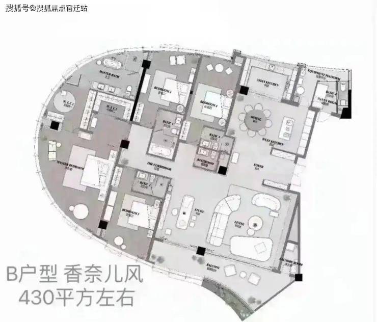 奢阔户型设计:主力户型430-450㎡,采用“4房+1房2厅6卫”豪华配置,公区面积近100㎡(如东边套12.4米开间双厅、南边套13.7米开间双厅),主人衣帽区带大幅落地窗,空间通透感极强12。