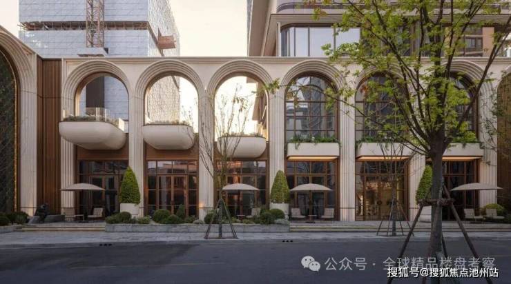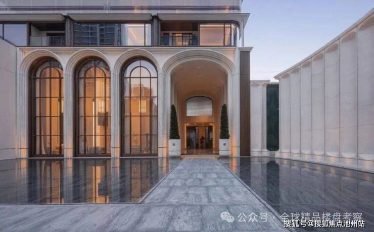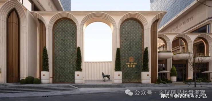 项目采用12米高拱券大门、宝格丽绿石材与古铜金属线条交织,形成迎宾序列;意大利贝金米黄石材弧形景墙与铜马雕塑传递“龙马精神”寓意。近十二米通高的拱券,通体以石材打造,层层叠涩,气势恢宏。