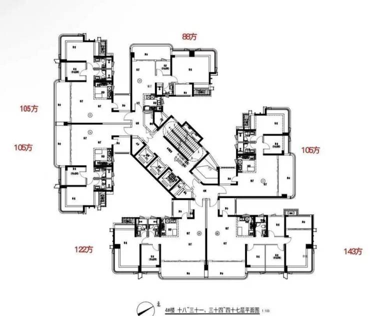 6个户型,朝向分别为:88平朝西北,2个105平朝西南,122平和143平朝东南,还有一个105平朝东北,不分户型大小,全都是3.05米层高