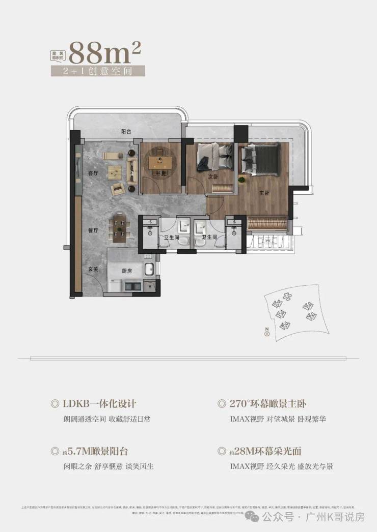 88㎡户型,约5.7M巨幕阳台 | 270°环幕瞰景主卧|LDKB一体化设计