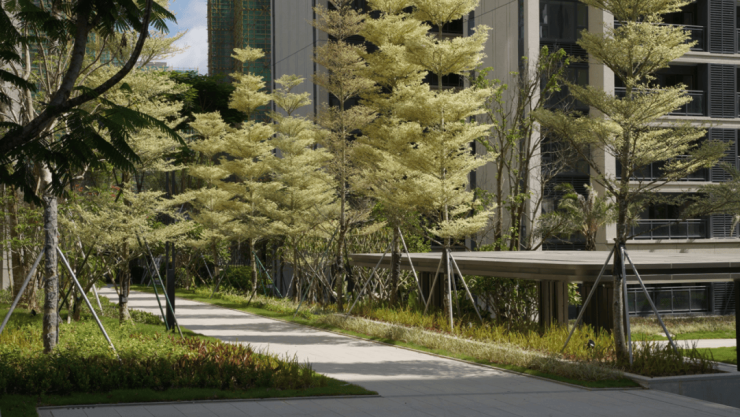 新加坡风格园林,以两轴一心多组团的规划布局,通过轴线设计营造出对称与秩序感。采用成品全冠移栽技术,力求“春有花、夏有荫、秋有果”,打造“城市花园”与“艺术空间”的双重居住体验。