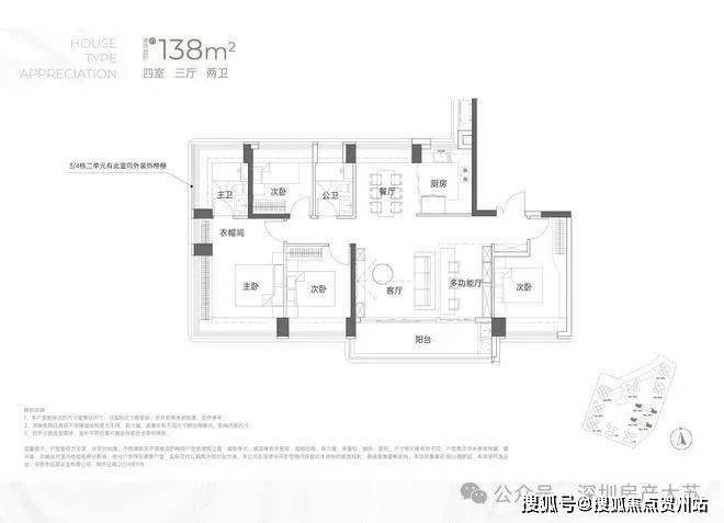 竖庭格局,西南向,基本居住功能与建面约108-110㎡4房2卫一致,但格局不一样,从目前公布的户型图上看,主要是主卧空间有了更大的提升,比如可以放更大一点的衣柜。但从位置上看,它所在的楼栋更靠近主干道,会有噪音影响。