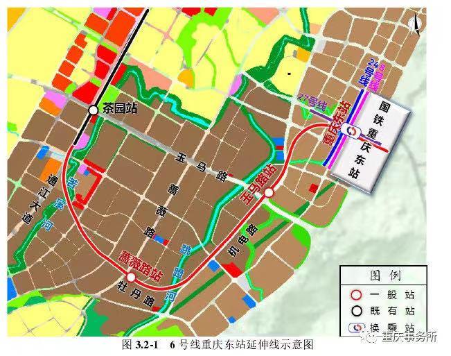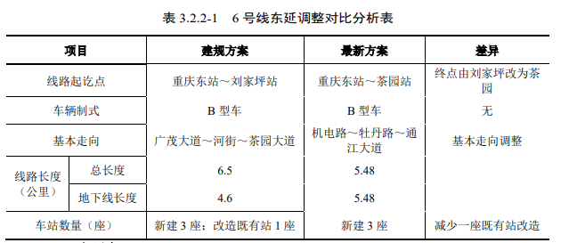 6号线东延线从茶园到重庆东站,共6.5公里。调整方案由自既有6号线刘家坪站引出支线衔接重庆东,调整为自既有6号线茶园站采用主线直接延伸引入重庆东站。