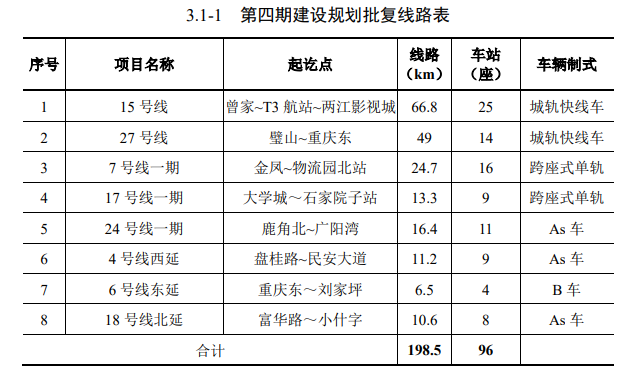 2019年重庆市编制完成了《重庆市城市轨道交通第四期建设规划(2020~2025 年)》。增加轨道交通 4号线西延、6号线东延、7号线一期、8号线一期工程、15号线、17号线一期、18号线北延、24号线一期、27号线,线路总长229.7公里。