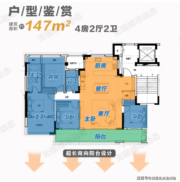 建面约147㎡洋房:户型周正,全明户型,南北通透;四开间朝南,客餐厅一体连接南向超长阳台,搭配大面积落地玻璃,大气格局入户即启;星级主卧套房,独立阳台,给到远超同面积段的生活获得感。
