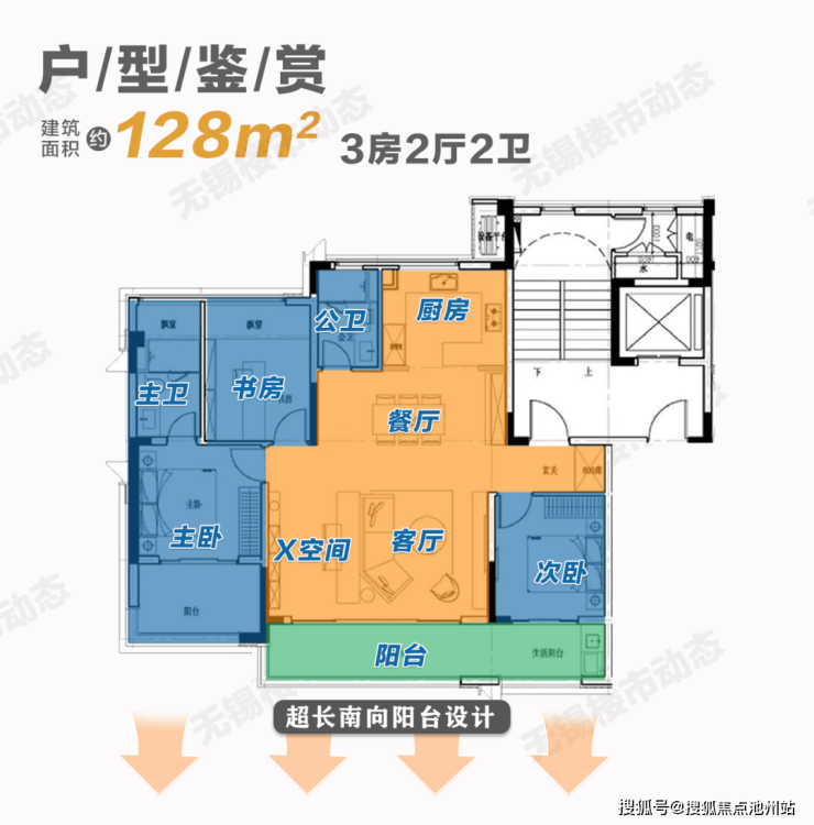 建面约128㎡洋房:入户有独立玄关,并配备收纳空间;三开间朝南,南北通透,南向超长阳台将室内的利用面积更大化,并且采用大面积落地玻璃,采光非常好。百变X空间,后期业主自由发挥。