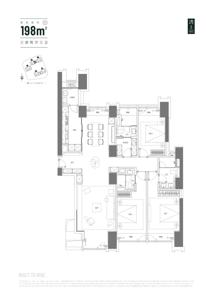 198㎡户型,标准的三开间朝南,大十字户型,配置有一座封闭阳台与五个独立大尺度飘窗,南北通透;