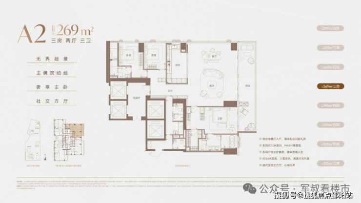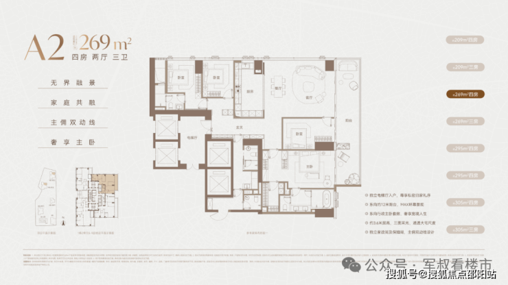 ③269户型的总价和295户型总价差不多,主要景观朝东,超大尺度阳台,并且有独立的家政保姆间,主服动线分离,是本次最小面积带保姆间的了,当然也可以作为储藏间使用;也是可以实现4房使用,但我个人更喜欢做3房的布局,1单元低区正对公园或者高区看海,超大客厅+超大阳台,4500万左右的价格确实听打动人,预算不超5000万但又想买超大阳台和景观更好的家人们,可以重点关注!