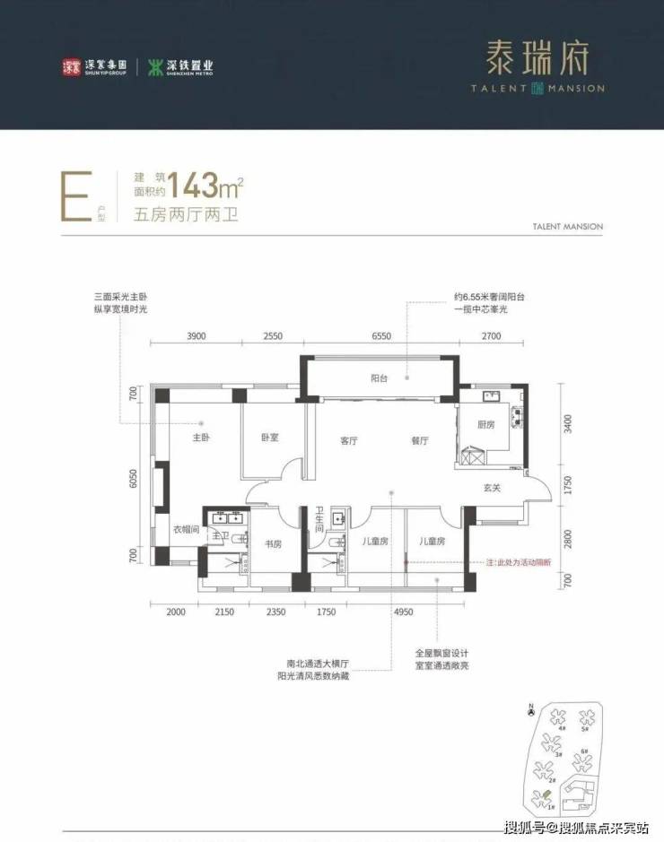 115-143㎡的4房2厅2卫,设计的横厅南北通透格局,半开放式厨房,其中143㎡主卧有独立衣帽空间。