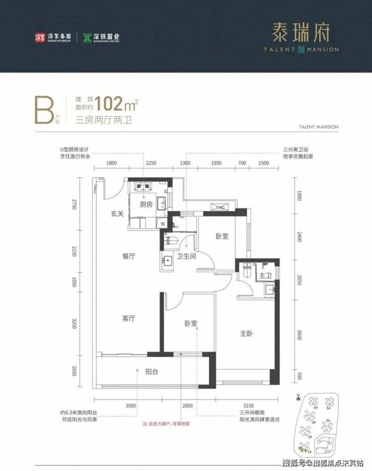 102㎡的3房2厅2卫,设计的竖厅格局,客厅连着卧室出大阳台,U型厨房,有东南朝向及西南朝向。