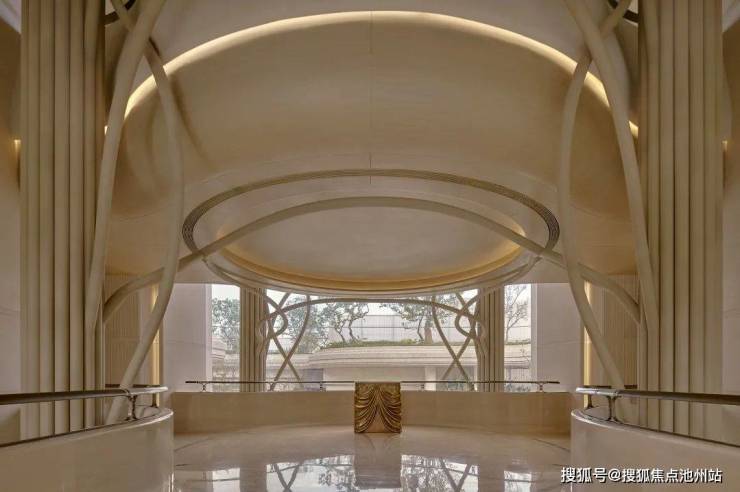 大门内外两重门厅景墙运用月光米黄石材近1000 方,搭配香槟金金属线条,汲取爱马仕全球旗舰店的双曲面叠墙造景手法,增加景墙奢华质感。 项目沿河的楼幢整体上抬,也就是——抬地式。好处在于地库通风,客户行车归家动线更合理。