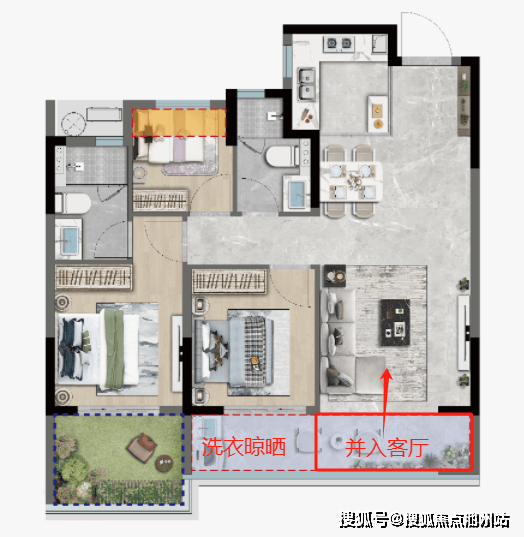 在户型设计时,项目将包好的生活阳台做到完全室内化。