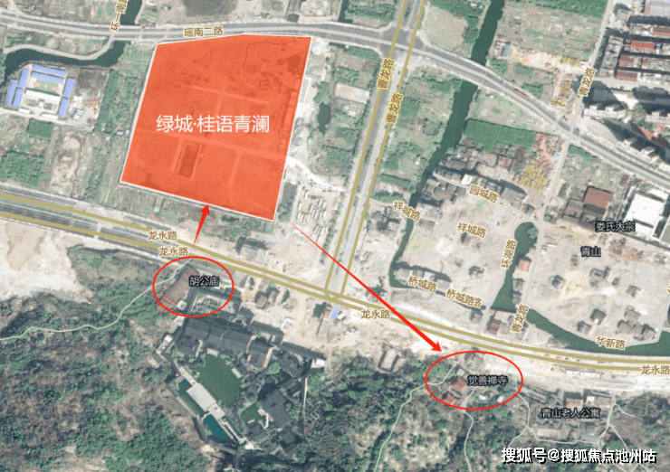 再比如,桂语青澜正南面有着一座胡公庙,东南面还有一座觉善禅寺,两者皆有香火供奉,如果按照部分民间流传,住宅正南方若有庙宇,或会出现“灾煞”;而东南方若有寺庙镇压,则可能影响气脉走向。