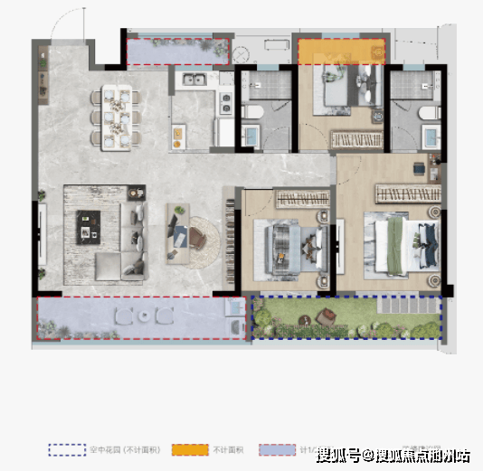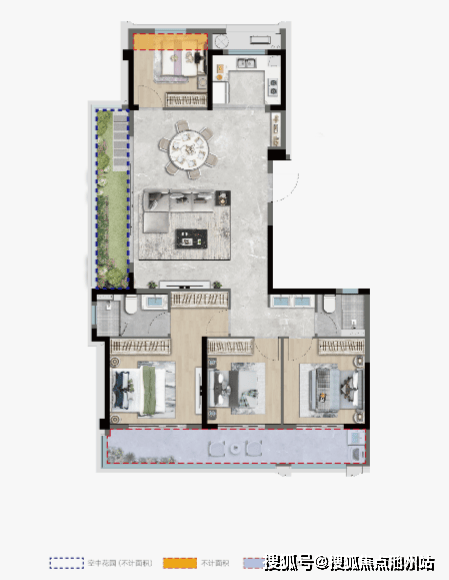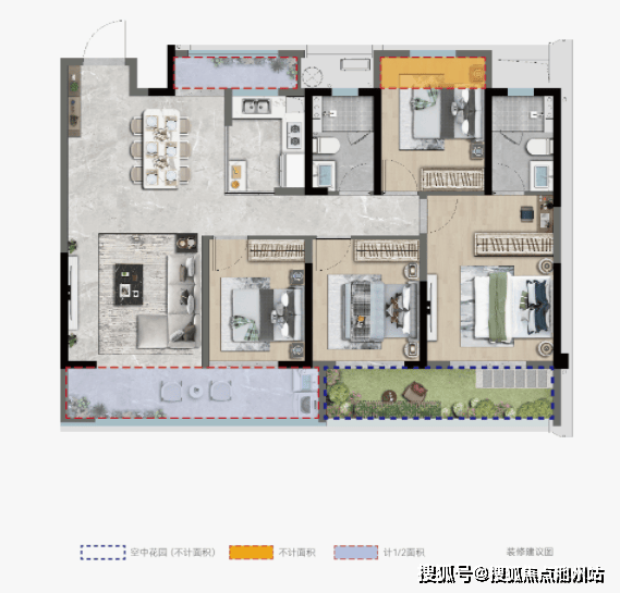 功能上,动静分区。北向房间可做娱乐房,并入客餐厅与“空中花园”联动,营造多功能社交空间。