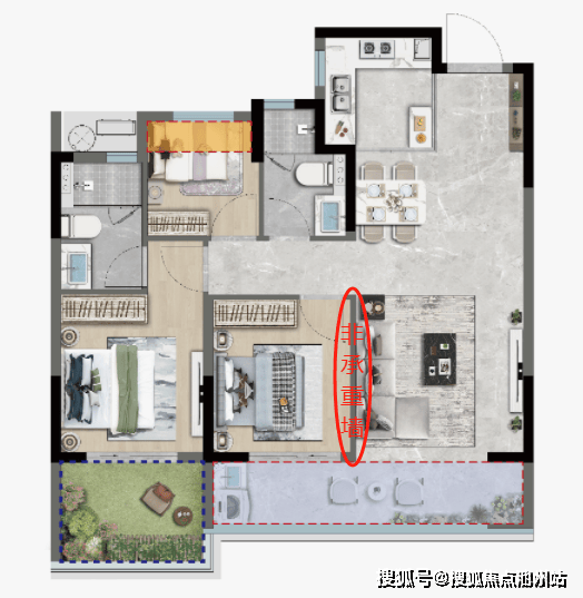 追求气派居住体验的话,客厅、次卧之间非承重墙,则可全部打通纳入客餐厅系统,开放式书房、钢琴...那么它的公区尺度甚至可以直追市面130㎡以上大面积户型。