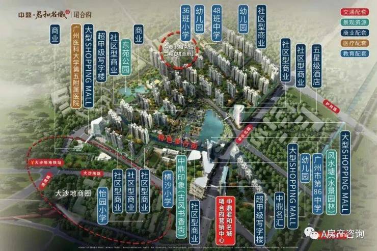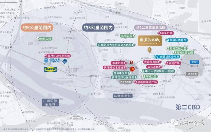 5公里范围内,则有美林新天地、优托邦、漫广场3大商业综合体。别忘了,还有广州头家华润万象城,预计今年年底动工。