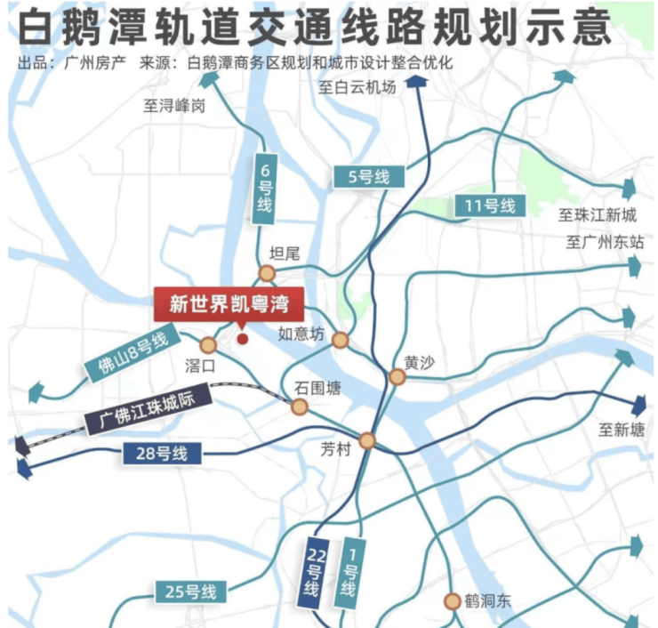 项目周边5、6、11号线交汇环绕,从小区正门步行至5号线首发站滘口地铁站,直线距离仅约700米左右,可一路0换乘直达珠江新城,是名副其实的黄金5号线地铁上盖好盘。
