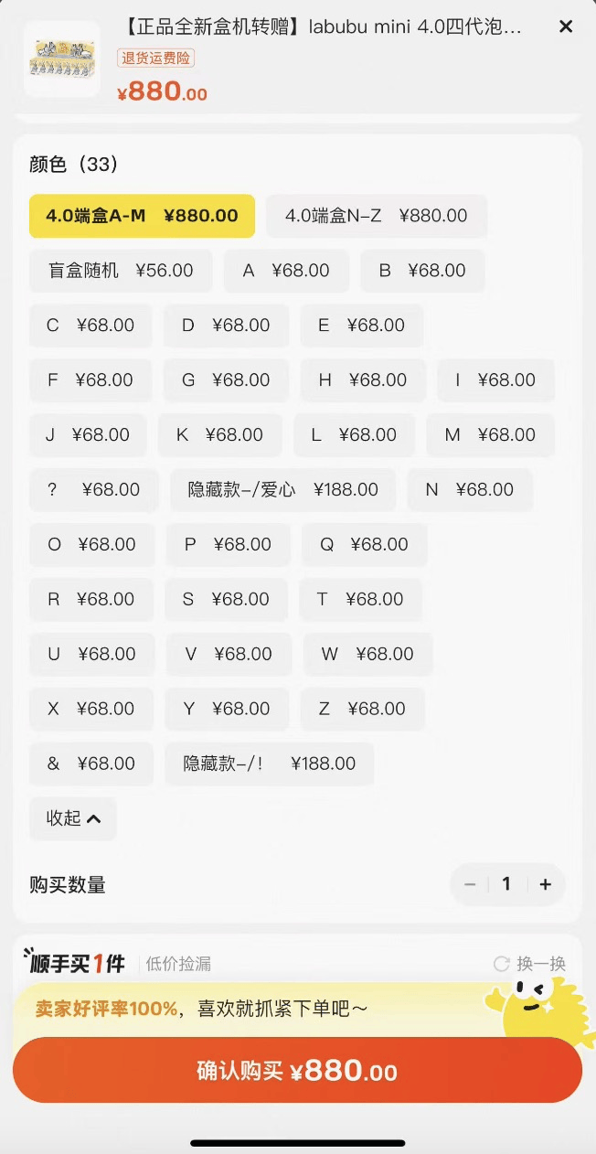 开售当晚,在二手交易平台,整端二手价从1500元至3200元不等,单盒售价在89元至240元之间,隐藏款(“爱心”和“叹号”)的成交价格飙升至近千元。