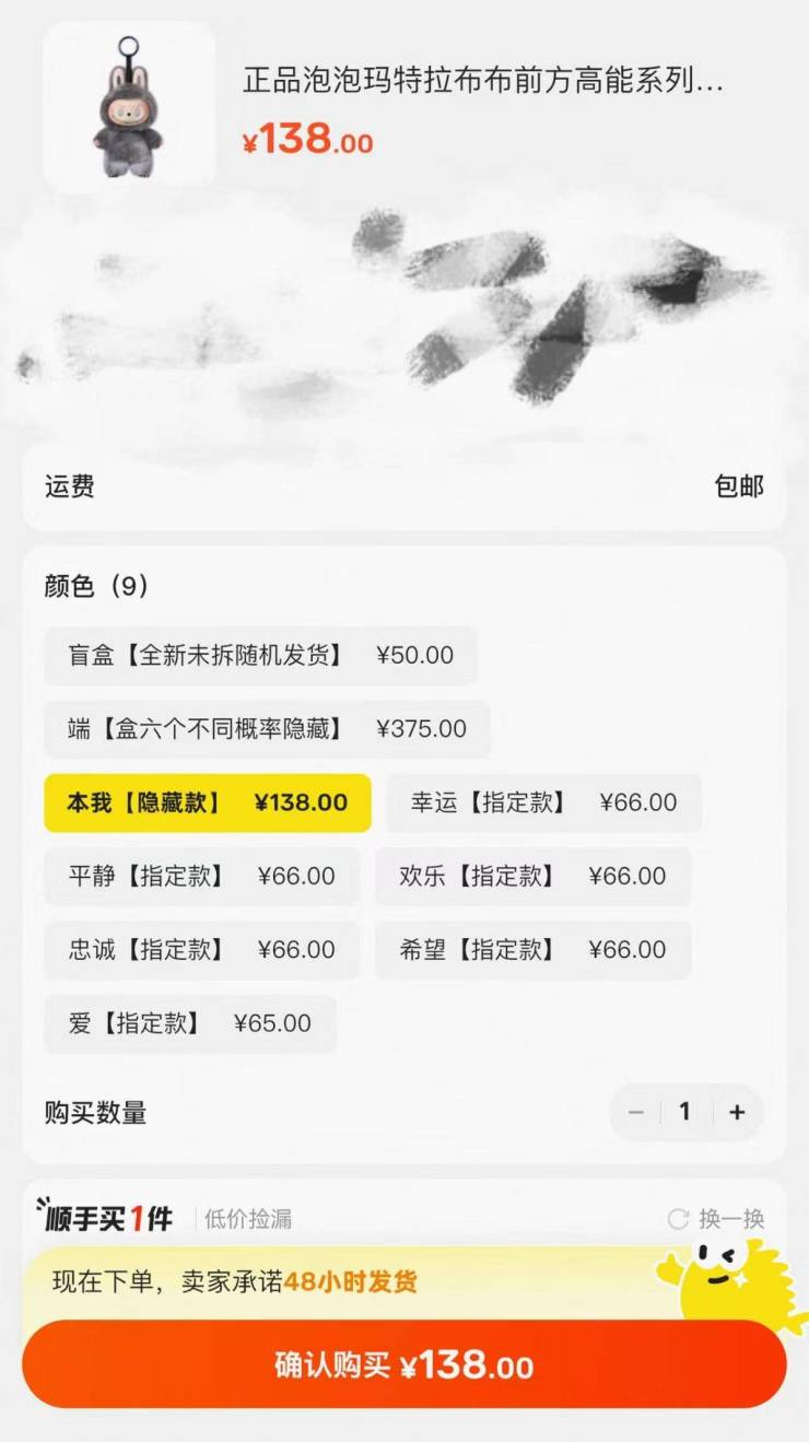 隐藏款外,“幸运”“希望”“欢乐”等常规款的价格更是看低,有商家迫于积货压力,给出66元的破发售价。如果用户不指定款式,单只随机盲盒的价格低至50元。要知道,这些款在年中也都曾卖出成百上千元。