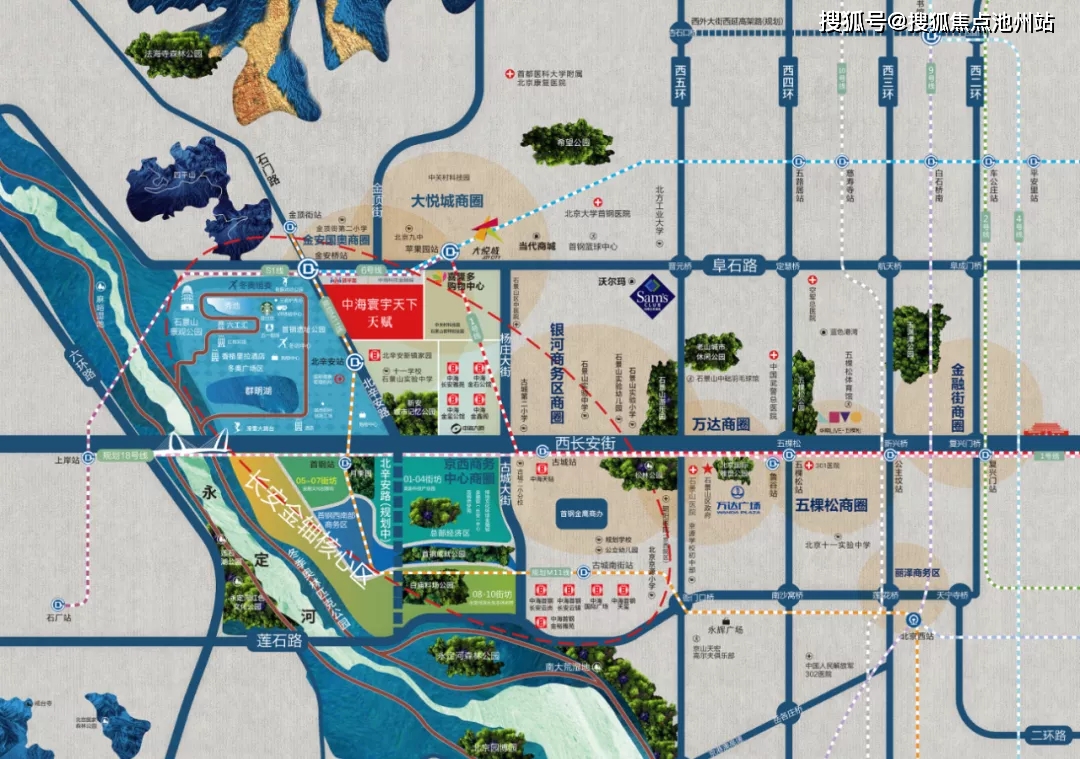 位置信息:中海寰宇天下·天赋位于石景山区北辛安核心区,距离六号线金安桥地铁站仅300米,享受全区少有三轨交汇TOD交通枢纽以及3km内5大商超环绕,尽享美好生活。