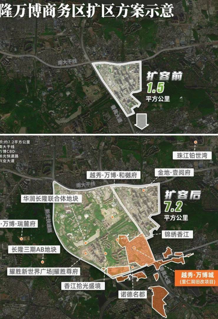 万博官宣扩容,占地面积由1.5平方公里延展至7.2平方公里,覆盖长隆、里仁洞片区,规模甚至超越6万平方公里的珠江新城,剑指世界级地标商圈。