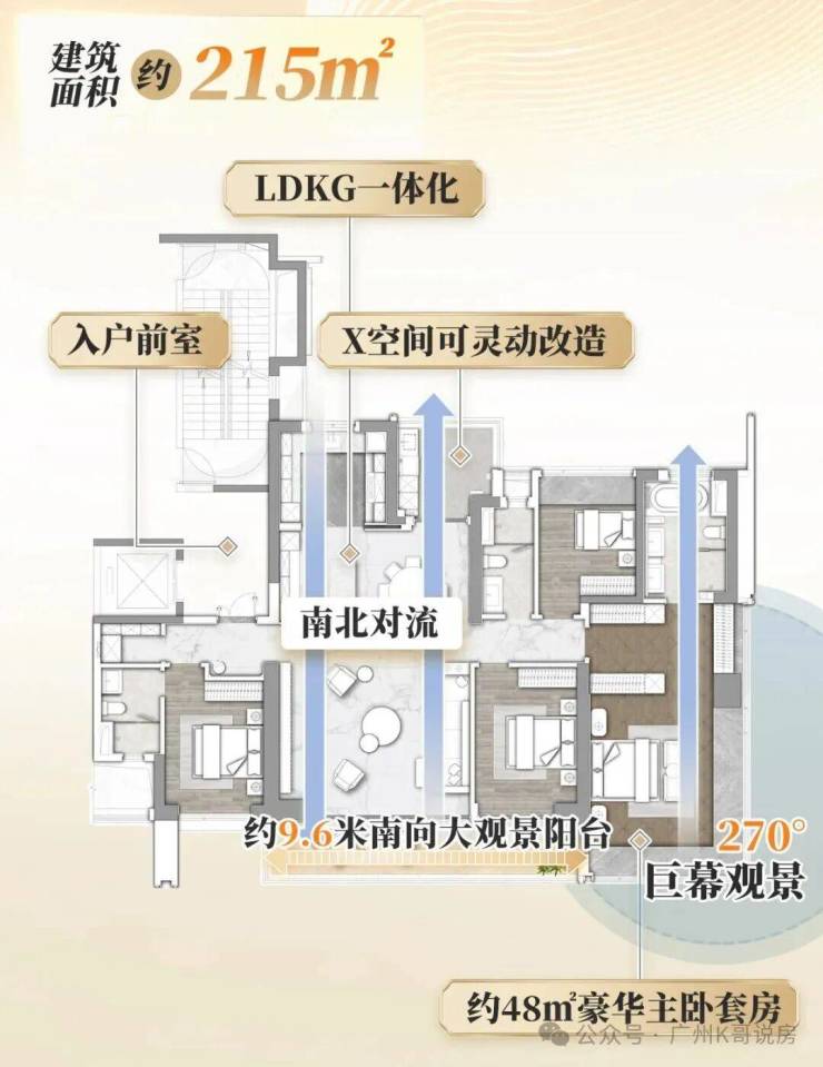 215㎡大平层,3梯3户,带超大入户前室,拥有约9.6米南向大景观阳台,和主卧270°观景飘窗,看园林景观。