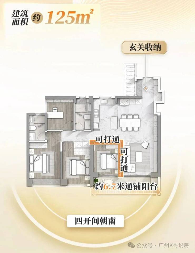 整个LDK一体化超聚厅开间达6米,若将客厅与多功能房打通,横向尺度更可延展至惊人的约9米。