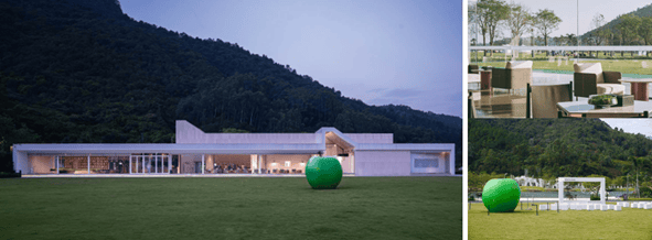 小镇生活体验馆:由大匀设计,是一座通排落地玻璃窗的白色建筑,位于小镇中心湖大草坪一侧。现代极简的几何造型,窗明几净的材质搭配,赋予场馆特殊的标志符号。它是游客到访小镇的第一站,是文化展览等活动的举办地,也是社区业主的精神空间,人们在此阅读、会谈、聆听、交流。