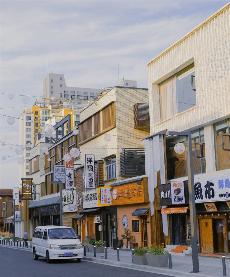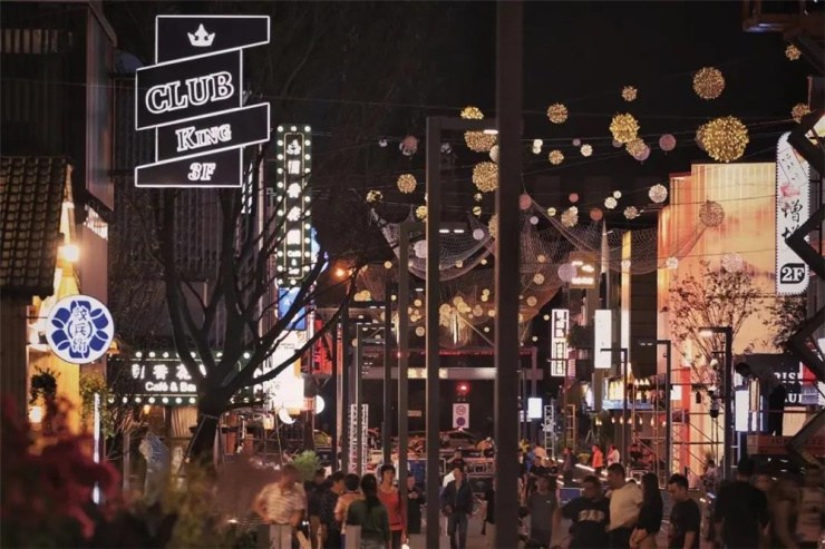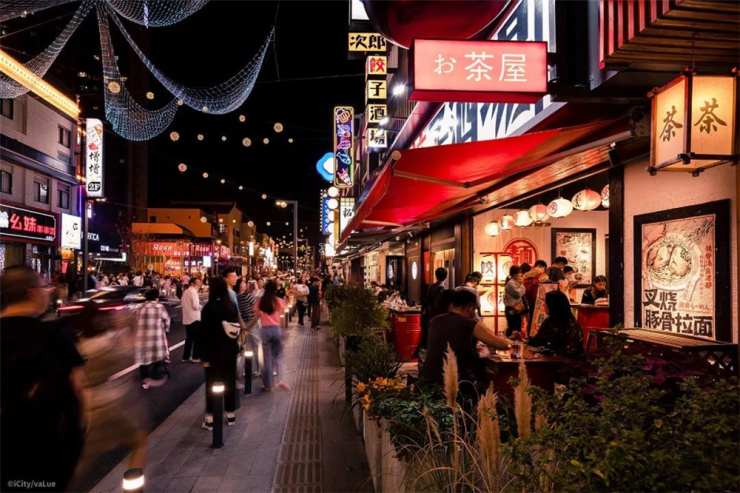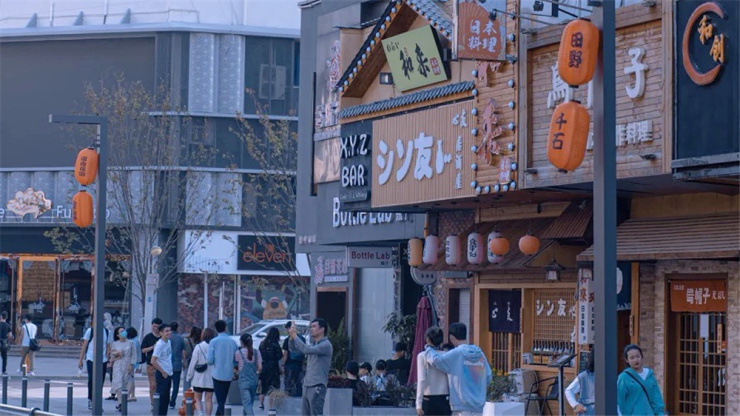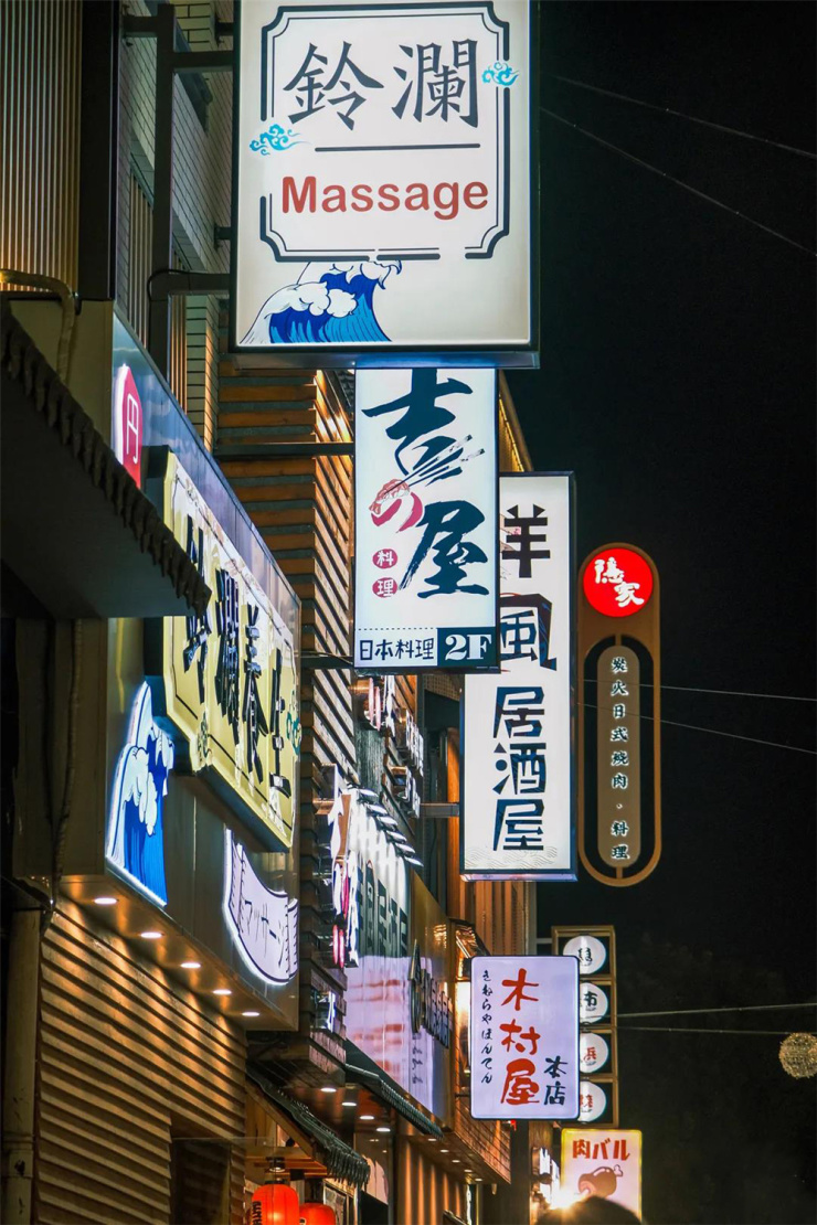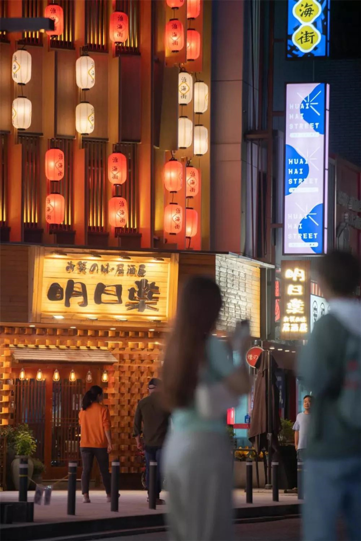 路灯,灯箱和悬挂的氛围灯,洗墙灯相互点缀,在夜晚随手一拍,都是满满的烟火感。在家门口就能充分体验日式街道的魅力,和“假出国”一般的城市微度假属性不谋而合。