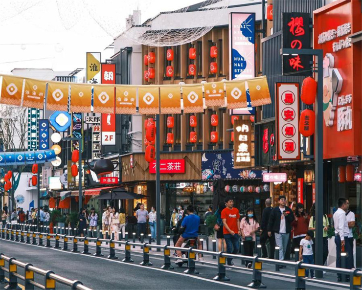 从街道、建筑、临街商业、景观休闲和文化等整合成一体,结合淮海街的苏州在地性和日本社群文化特点,打造了一个结合中外文化特点的特色街道,让市民和游客不出国门就能体验到不一样的地域风情。