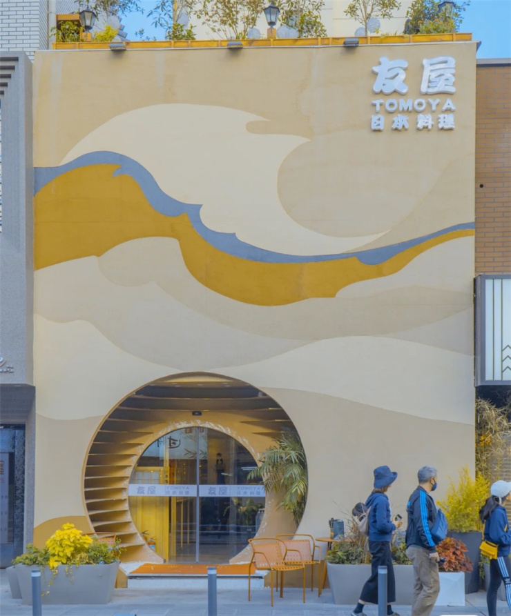 淮海街项目在原有“日料街”风貌的基础上,打造了一条真正的日式风情街道:在匹配运营的基础上,为每一家店再次设计了门头,并通过色彩与材质的表达,打造门头与立面之间的对比配合,让每一家店既“独立”,又成为街道主题的一部分。