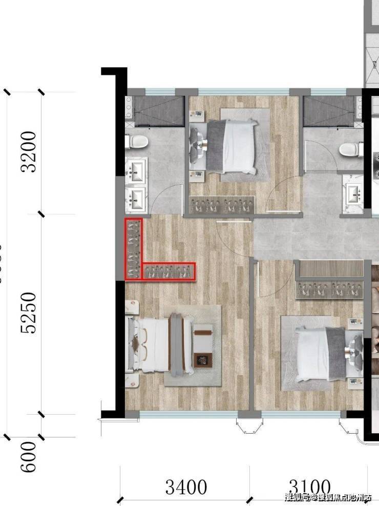 ---主卧进深达到约5.25米,这个尺度以往也是“大户型专配”,可以很宽裕地做“L型步入式衣帽间”。