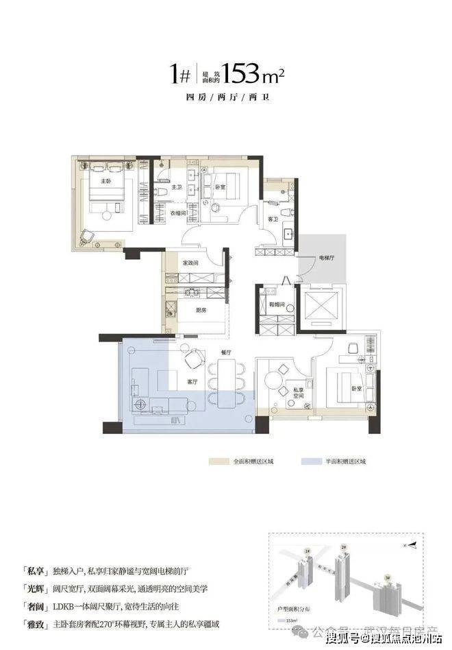 其中,1号楼和2号楼,2-15F都是153㎡户型;16F及以上,西边户是188㎡户型,东边户是153㎡户型。