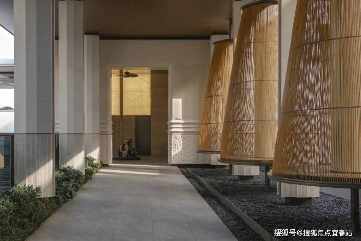 入口广场以人字形铺陈的石板地面为中心,两侧设低矮水渠。主入口摒弃了传统高耸大门或厚重墙体,代之以四根轻盈的弧形柱体,支撑起悬挑屋面。