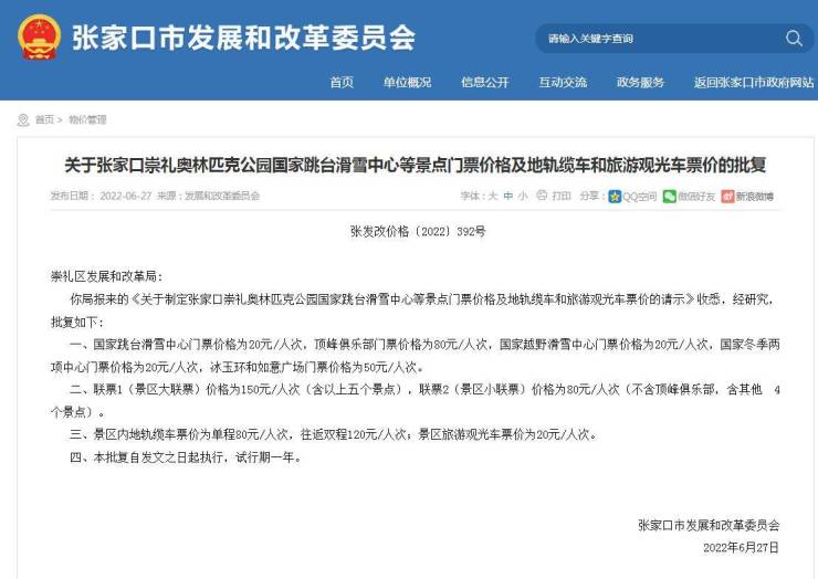 张家口市发改委近日发布公告,对崇礼区发展和改革局《关于制定张家口崇礼奥林匹克公园国家跳台滑雪中心等景点门票价格及地轨缆车和旅游观光车票价的请示》进行批复。该批复自发文之日起执行,试行期一年。