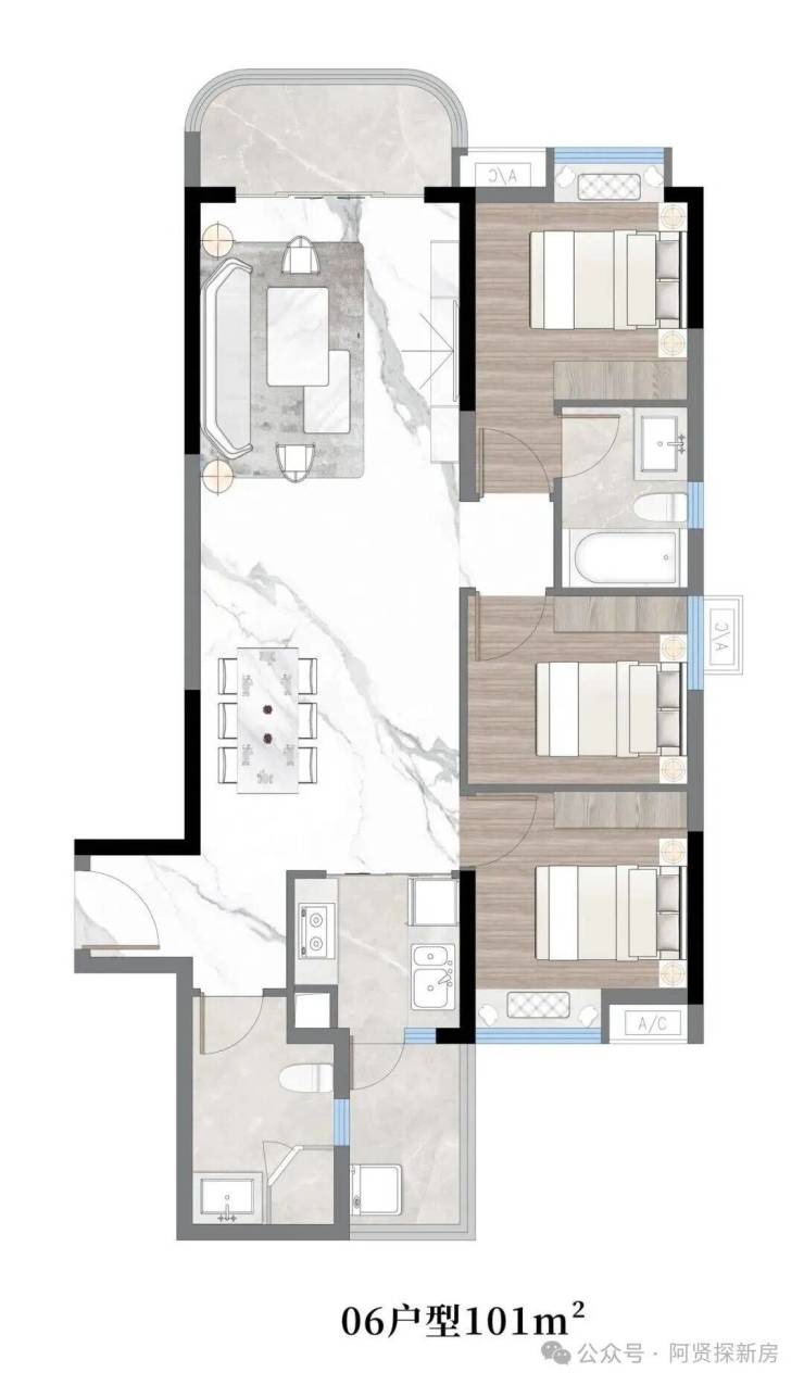 06户型:约101㎡,三房两厅两卫带主套